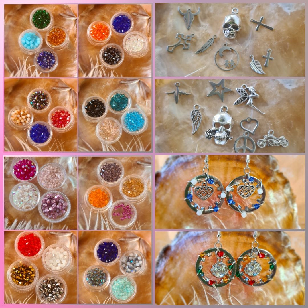 Verwendete Materialen: Edelstahlelemente, Silberdraht, Kristallelemente und Charms.